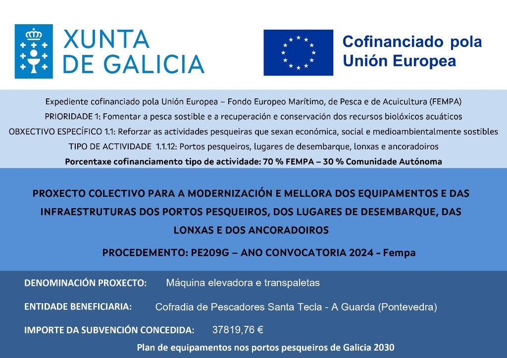 Este proxecto foi cofinanciado polo FEMPA nun 70% (54502,56 €uros) e pola Comunicade Autónoma de Galicia nun 30% (23358,24 €uros), ascendendo o importe da subvención a 77860,80 €uros