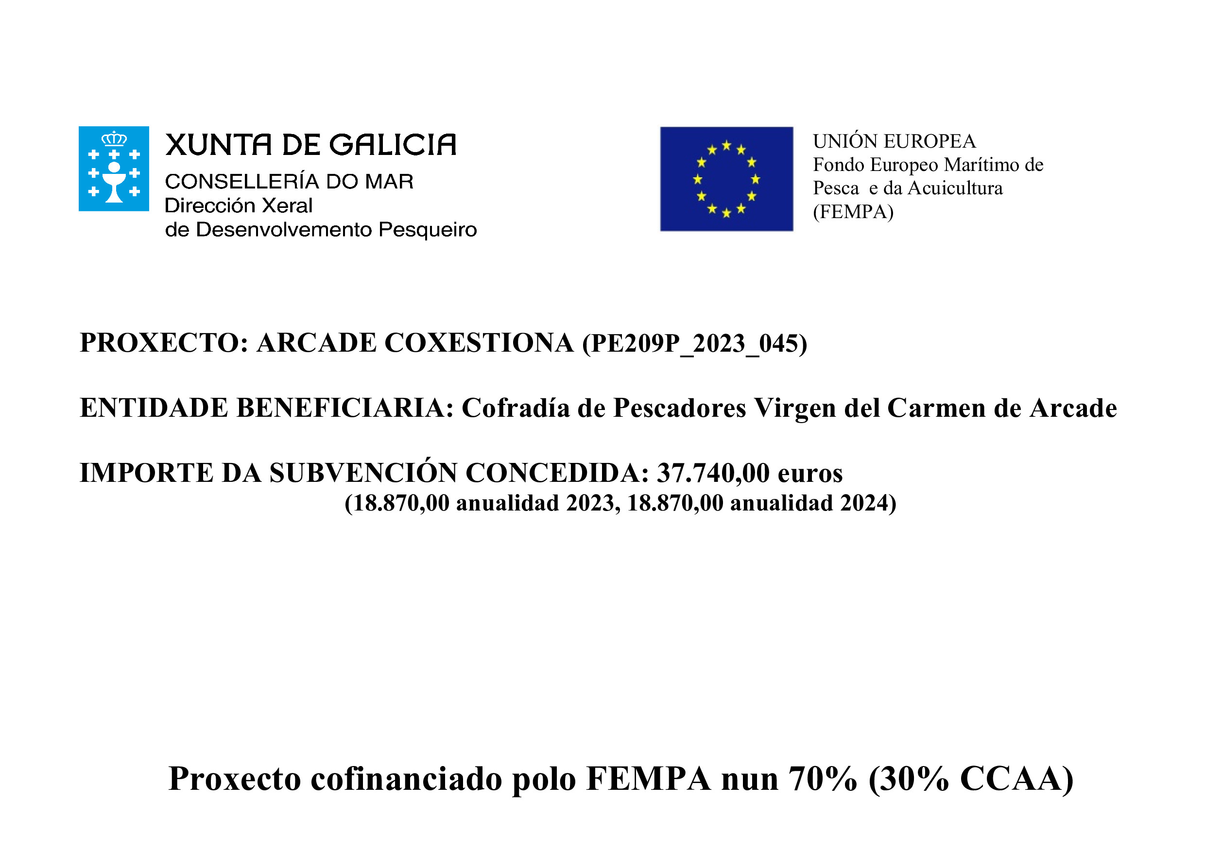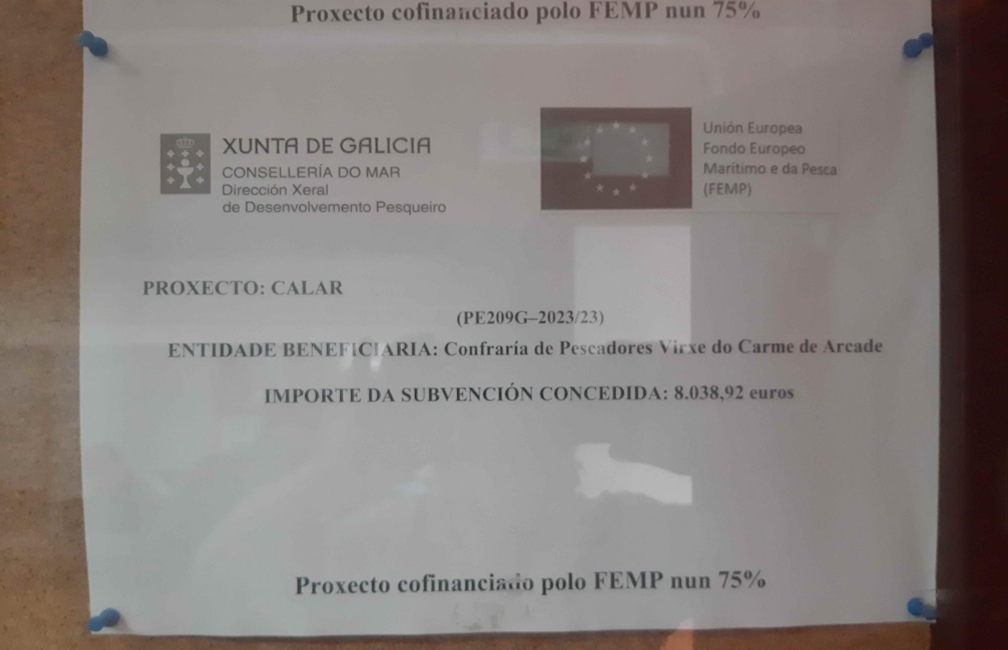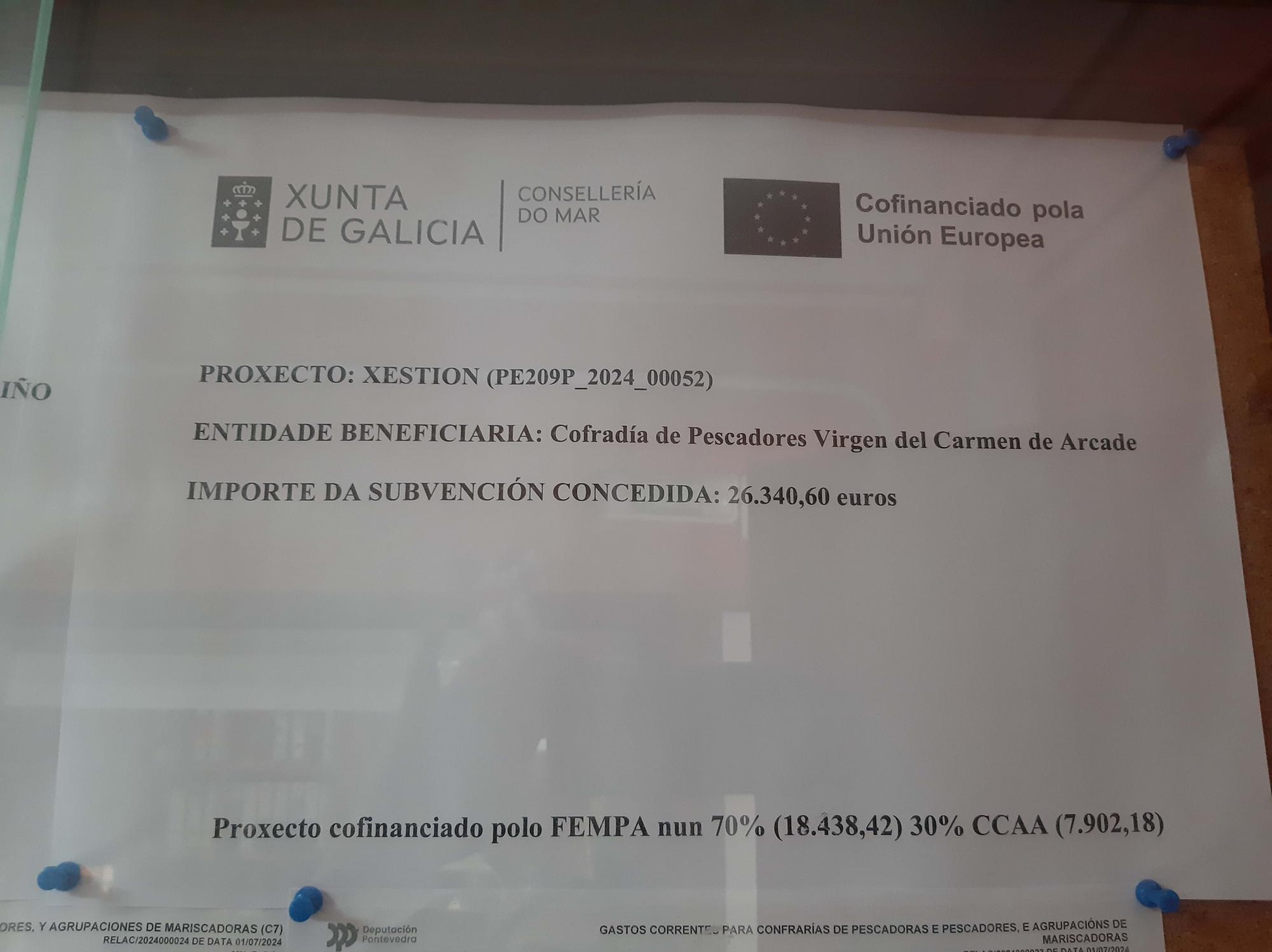 O mes de xuño do pasado 2023, ao abeiro da orde de axudas a confrarías de pescadores, federación de confrarías e agrupación de mariscadoras da provincia de Pontevedra, a Deputación de Pontevedra concedeulle á Confraría de Arcade unha axuda para melloras na eficiencia de iluminación e para adquisición de equipamento (impresora, guillotina, aspirador...) por un valor de 1.559,13 euros.