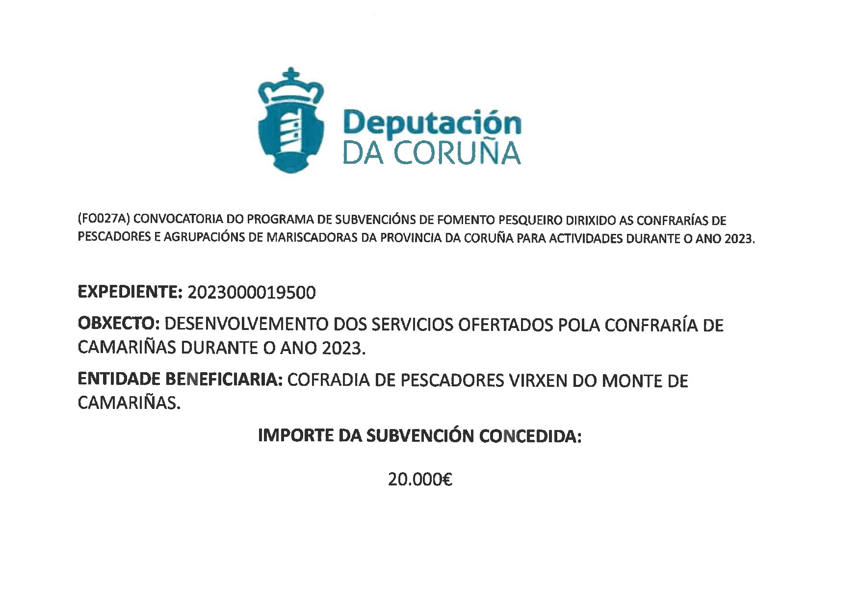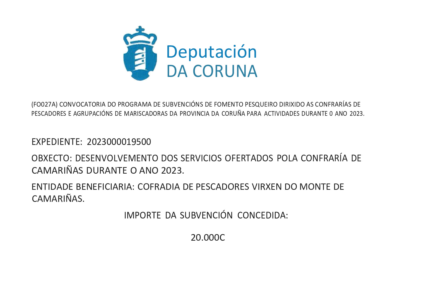 REFORZO A XESTIÓN DOS RECURSOS DA PESCA COSTEIRA ARTESANAL PARA GARANTIR UNHA ACTIVIDADE ECONÓMICA, SOCIAL E AMBIENTAL SUSTENTABLE NA CONFRARÍA DE PESCADORES "VIRXEN DO MONTE" DE CAMARIÑAS 2024-2025 (PE209P-2024-00047)