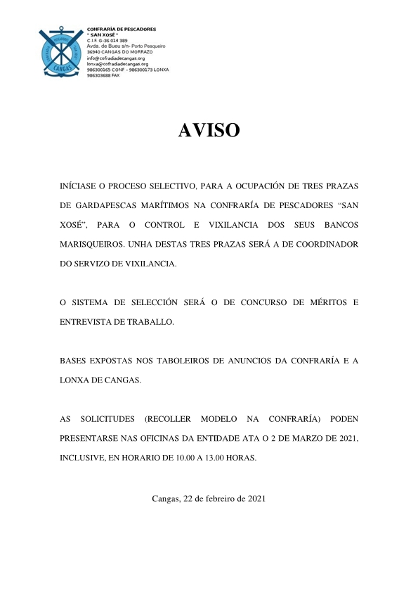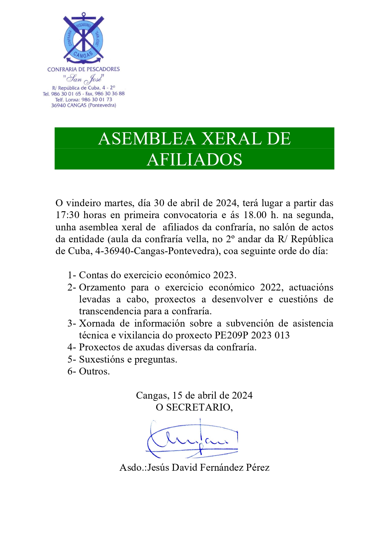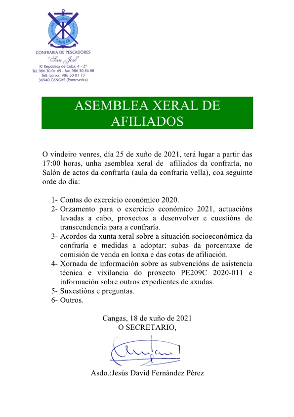 Lugar: En Cangas, en el salón de actos de la Cofradía , situado en la calle República de Cuba nº 4- 2º (en las inmediaciones del ayuntamiento de Cangas).