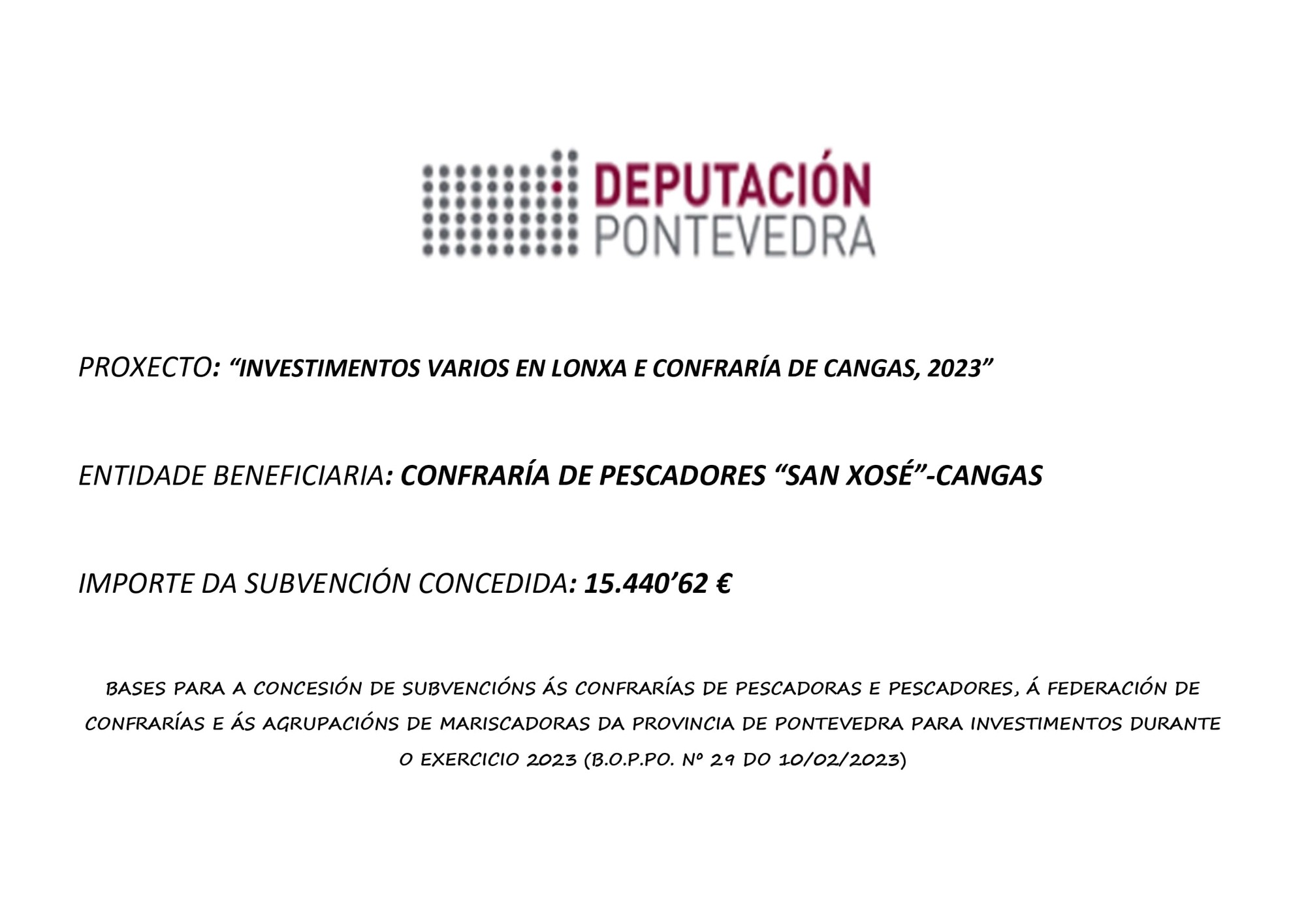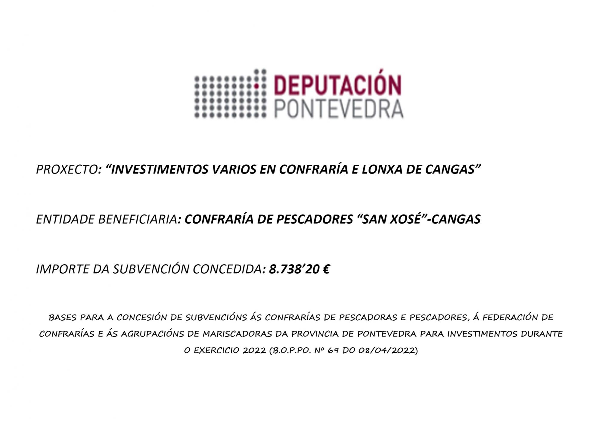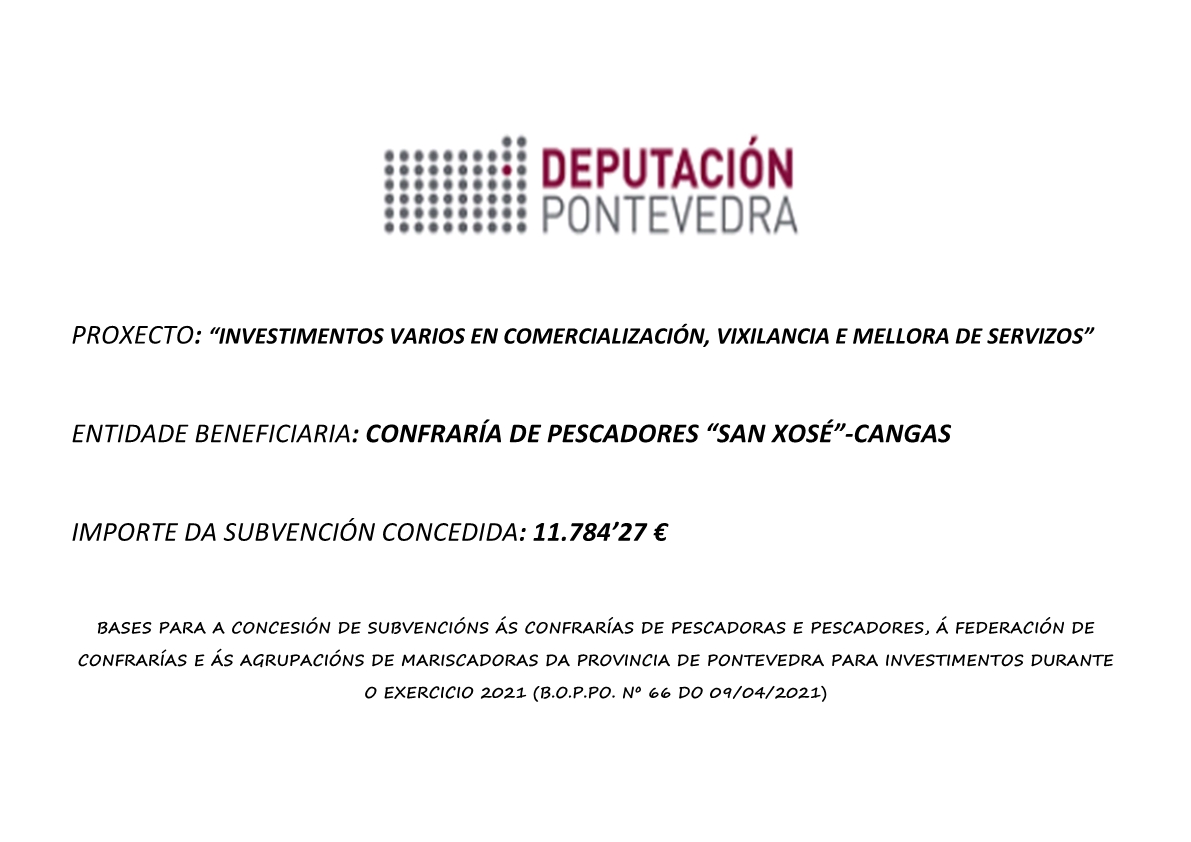 Consonte ao disposto no acordo da Xunta de Goberno da Deputación Provincial de Pontevedra, adoptado na súa sesión ordinaria do día 12 de maio de 2023, concerninte ao reparto de axudas a confrarías de pescadores, federación de confrarías e agrupacións de mariscadoras da provincia de Pontevedra, para investimentos no exercicio 2023, informamos de que na referida resolución se lle outorgou á Confraría de Pescadores “San Xosé” de Cangas, unha axuda de 15.440’62 €, para os conceptos “Instalacións de alarma contra incendios, sistema de videovixilancia e adquisicións varias”. Esta cantidade supón o 80% do investimento total efectuado.