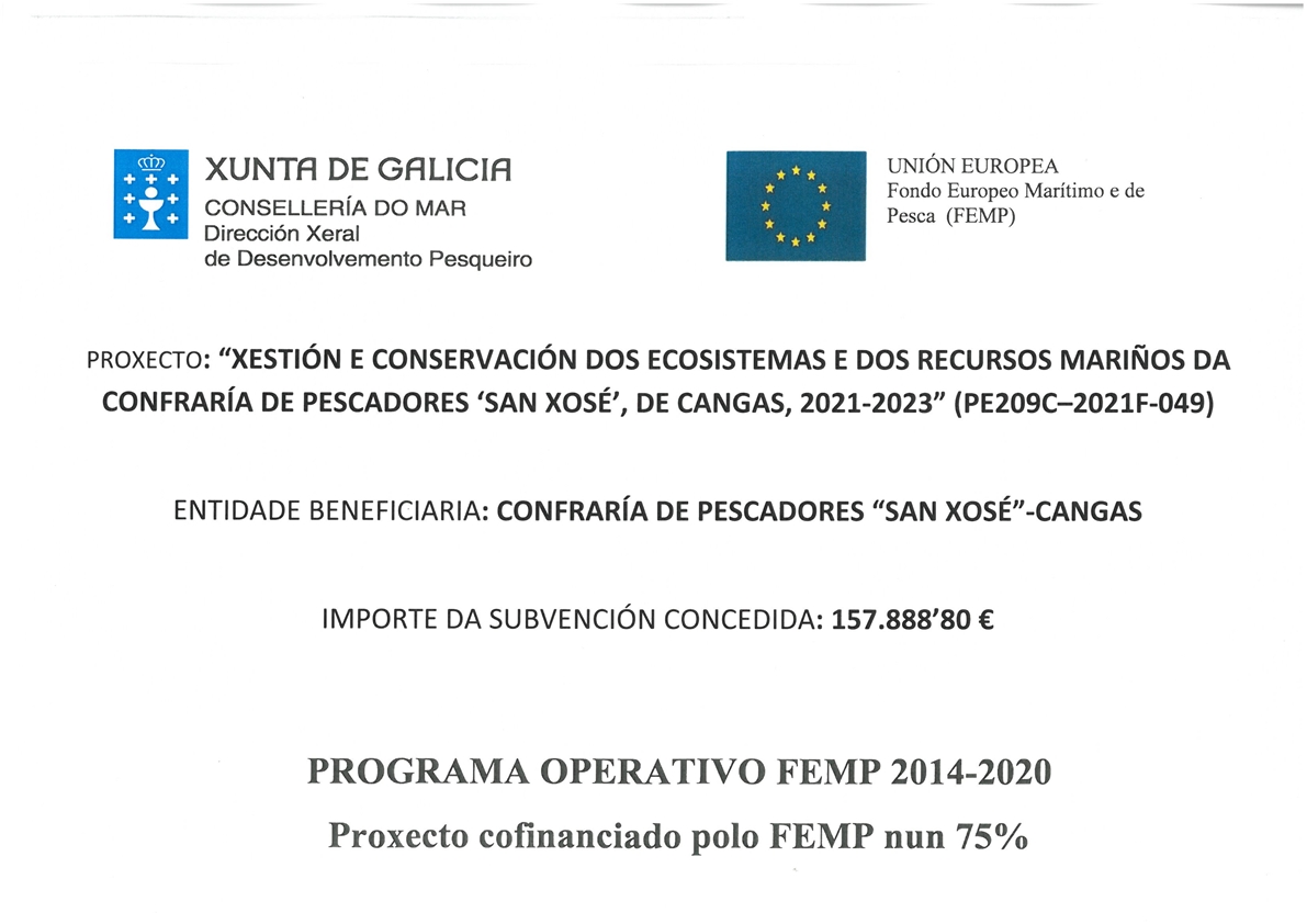 De conformidade co disposto na Resolución da Consellería do Mar, de data 5 de novembro de 2021, pola que se concede unha axuda ao proxecto colectivo “Xestión e conservación dos ecosistemas e dos recursos mariños da Confraría de Pescadores San Xosé, de Cangas, 2021-2023” (Nº expediente PE209C-2021F-049), presentado pola Confraría de Pescadores de Cangas (NIF G36014389), ao abeiro da Orde do 10 de xuño de 2021, pola que se establecen as bases reguladoras xerais e se convocan para o ano 2021, para a concesión, en réxime de concorrencia competitiva, de axudas para proxectos colectivos financiados polo Fondo Europeo Marítimo e da Pesca (FEMP), que contribúan a protección e recuperación da biodiversidade mariña a través dunha mellor xestión e conservación dos recursos mariños e dos seus ecosistemas, así como ao fomento da sensibilización ambiental, por un importe de 157.888,80 €, co seguinte reparto anual: 42.117,66 € correspondente á anualidade 2021, 77.180,76 á anualidade 2022 e 38.590,38 € á anualidade 2023. A subvención outorgada acada as contías máximas subvencionables. Dentro destas, as porcentaxes teñen a seguinte distribución, o 75% corresponden aos fondos FEMP, 118.416,6 € e un 25 % da Comunidade Autónoma de Galicia, 39.472,20 €.