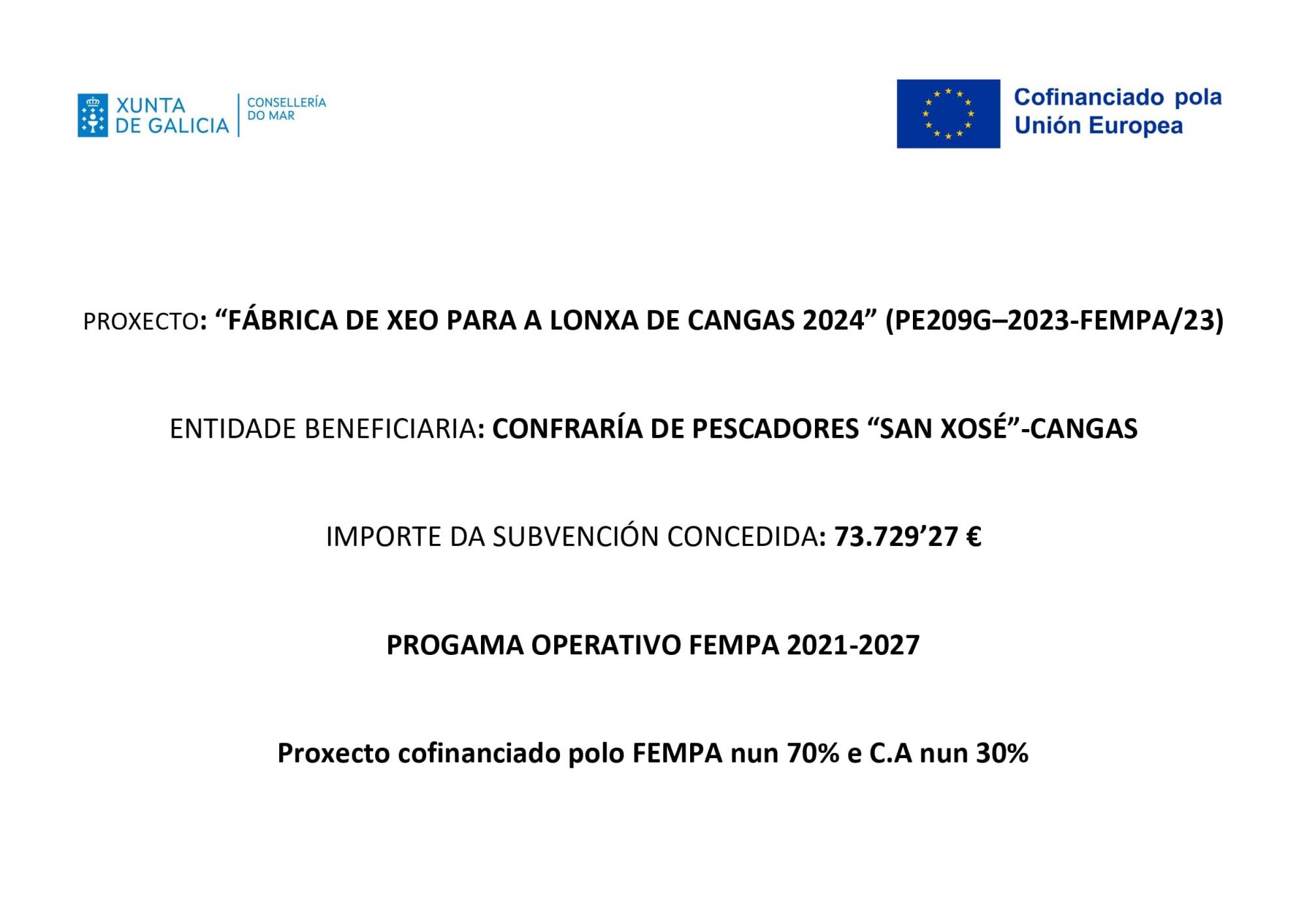 Consonte ao disposto na Resolución da Consellería do Mar pola que se concede unha axuda ao proxecto colectivo “Fábrica de xeo para a lonxa de Cangas 2024” presentado pola Confraría de Pescadores ‘San Xosé’ de Cangas (NIF G36014389), para dotar á lonxa de Cangas dun novo xerador de xeo para o servizo da fábrica de xeo, cofinanciado polo Fondo Europeo Marítimo e da Pesca e de Acuicultura (FEMPA), ao abeiro da Orde do 16 de outubro de 2023, pola que se establecen as bases reguladoras xerais e a segunda convocatoria para o ano 2023, para a concesión, en réxime de concorrencia competitiva, de axudas para proxectos colectivos de modernización das infraestruturas dos portos pesqueiros, das lonxas ou establecementos autorizados para a primeira venda de produtos pesqueiros e dos lugares de desembarque, para a mellora da eficiencia enerxética, da protección do ambiente, da seguridade e das condicións de traballo, da calidade e do incremento do control e da rastrexabilidade dos produtos desembarcados procedentes da pesca e da seguridade das infraestruturas, fronte a eventos meteorolóxicos provocados polo cambio climático, cofinanciada polo Fondo Europeo Marítimo, de Pesca e de Acuicultura (FEMPA), outorgóuselle á confraría de Cangas unha axuda de 73.729,27 €. Ao proxecto asignóuselle o número de expediente PE209G-2023-FEMPA/23.