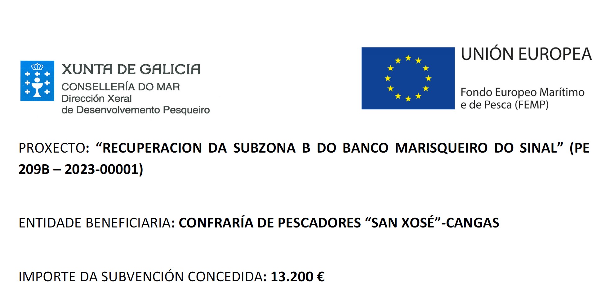 Consonte ao disposto na Resolución da Consellería do Mar, de data 19 de xullo de 2023, pola que se concede unha axuda para o proxecto “RECUPERACION DA SUBZONA B DO BANCO MARISQUEIRO PRAIA DO SINAL” (Nº expediente PE209B 2023), presentado pola Confraría de Pescadores de Cangas (NIF G36014389), ao abeiro da Orde do 21 de decembro de 2022, pola que se establecen as bases reguladoras xerais e se convocan para o ano 2023, en réxime de concorrencia competitiva, axudas a proxectos colectivos, financiados polo Fondo Europeo Marítimo e da Pesca (FEMP), para a conservación e restauración da biodiversidade e dos ecosistemas mariños no marco de actividades marisqueiras sustentables, outorgóuselle á confraría unha axuda de 13.200 euros.