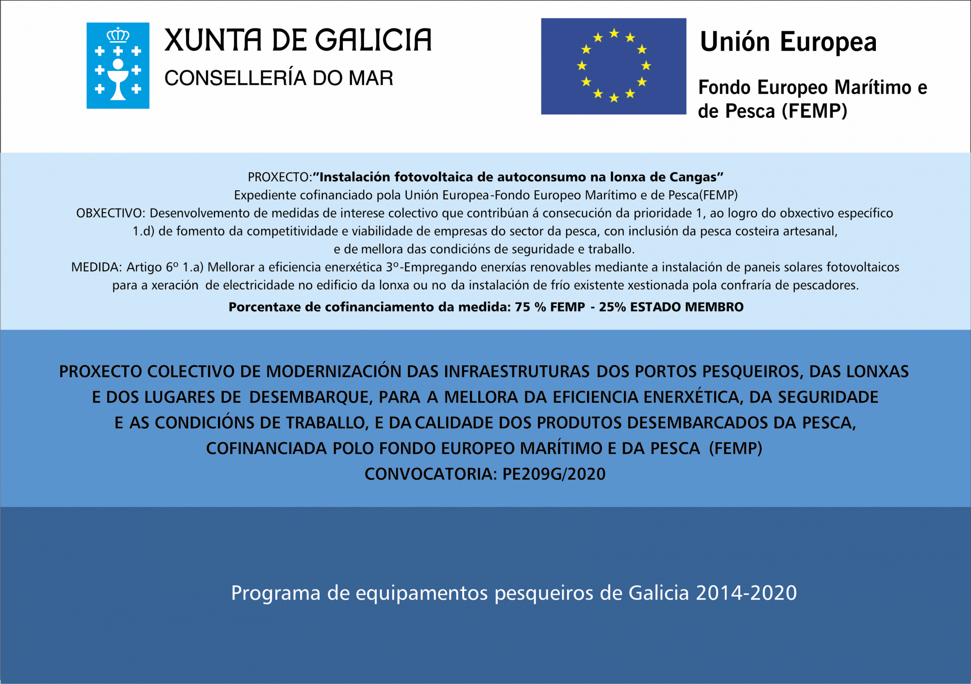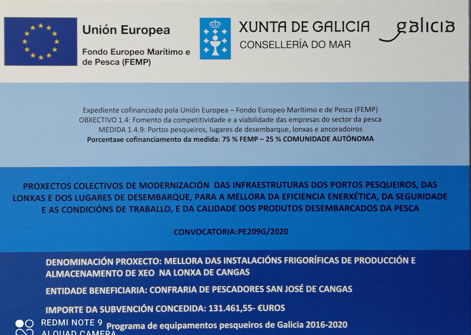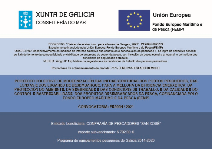 Consonte ao disposto na Resolución da Consellería do Mar, de data 9 de xullo de 2021, pola que se concede unha axuda ao proxecto colectivo “Reixas de aceiro inox. para a lonxa de Cangas, 2021” (Nº expediente PE209N-2020/53), presentado pola Confraría de Pescadores de Cangas (NIF G36014389), ao abeiro da Orde do 19 de xaneiro de 2021, pola que se establecen as bases reguladoras xerais e a convocatoria para o ano 2021, para a concesión, en réxime de concorrencia competitiva, de axudas para proxectos colectivos de modernización das infraestruturas dos portos pesqueiros, das lonxas e dos lugares de desembarque, para a mellora da eficiencia enerxética, da protección do ambiente, da seguridade e das condicións de traballo e da calidade e do control e rastrexabilidade dos produtos desembarcados da pesca, cofinanciada polo Fondo Europeo Marítimo e da Pesca (FEMP) e tramitada como expediente anticipado de gasto, para a adquisición e instalación de 56 reixas de aceiro inoxidable nos sumidoiros da lonxa de Cangas, co obxecto de mellorar a seguridade e as condicións de traballo dos/as usuarios/as das instalacións, a través dos fondos europeos (FEMP), por un importe de 6.792’00 €. A porcentaxe da subvención acada o 100 % do investimento, dos que o 75% corresponden aos fondos FEMP, 5.094’00 € e un 25 % da Comunidade Autónoma de Galicia, 1.698’00 €.