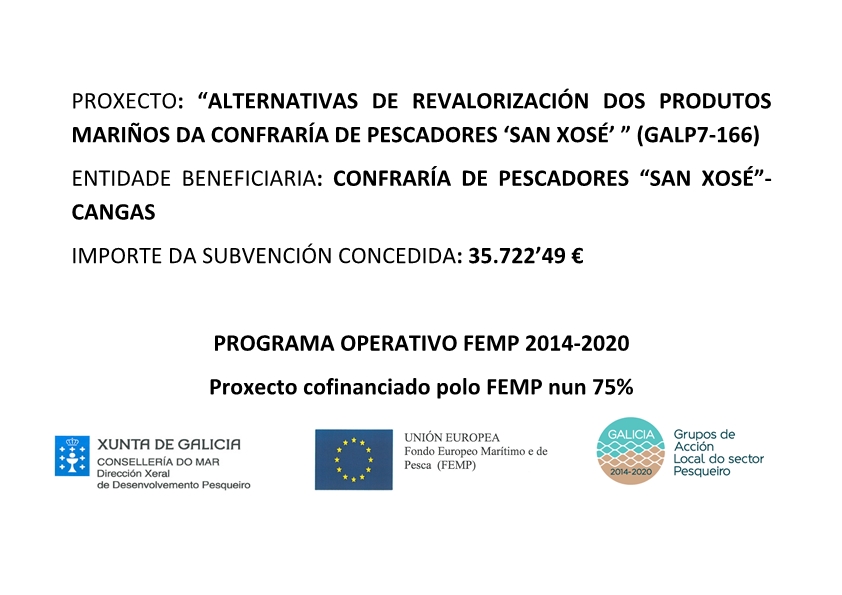 Consonte ao disposto na Resolución da Consellería do Mar, de data 30 de novembro de 2021, pola que se concede unha axuda ao abeiro das estratexias de desenvolvemento local participativo, para o proxecto “Alternativas de revalorización dos produtos mariños da Confraría de Pescadores ‘San Xosé’ de Cangas” (Nº expediente GALP7-166), presentado pola Confraría de Pescadores de Cangas (NIF G36014389), ao abeiro da Orde do 3 de agosto de 2021, pola que se establecen as bases reguladoras para a concesión de axudas para proxectos ao abeiro das estratexias de desenvolvemento local participativo (EDLP), aprobadas aos grupos de acción local do sector pesqueiro para o desenvolvemento sustentable das zonas de pesca no marco do Fondo Europeo Marítimo e de Pesca 2014-2020, e se convocan as correspondentes ao ano 2021, para pór en marcha e promover unha serie de iniciativas que nos permitan acadar un incremento no valor dos produtos pesqueiros e marisqueiros dos/as nosos/as asociados/as, nomeadamente coa posta en funcionamento dun centro de expedición e a distribución a domicilio, sen custe adicional, dos produtos adquiridos, a través dos fondos europeos (FEMP), por un importe de 39.691’66 €, para as anualidades 2021 e 2022: 1.080’00 € en 2021 e 34.642’49 € para 2022.