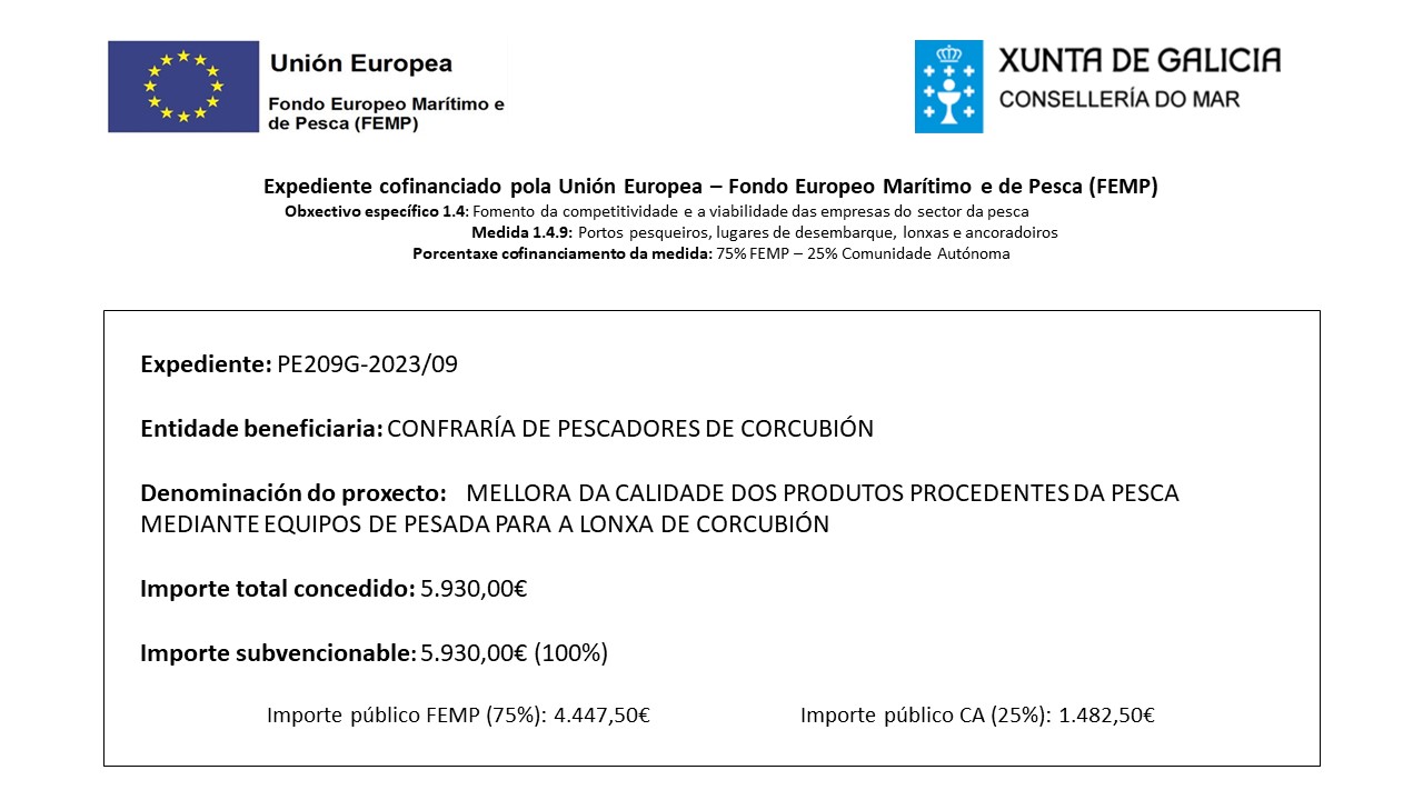 - Ao abeiro da Orde do 22 de decembro de 2022 pola que se establecen as bases reguladoras xerais e a convocatoria para o ano 2023 para a concesión, en réxime de concorrencia competitiva, de axudas para proxectos colectivos de modernización das infraestruturas dos portos pesqueiros, das lonxas ou dos establecementos autorizados para a primeira venda de produtos pesqueiros e dos lugares de desembarque, para a mellora da eficiencia enerxética, da protección do ambiente, da seguridade e das condicións de traballo, e da calidade e do control e da rastrexabilidade dos produtos desembarcados da pesca, cofinanciada polo Fondo Europeo Marítimo e de Pesca (FEMP) a confraría de pescadores de Corcubión presentou o proxecto colectivo "Mellora da Calidade dos produtos procedentes da pesca mediante equipos de pesada para a lonxa de Corcubión".