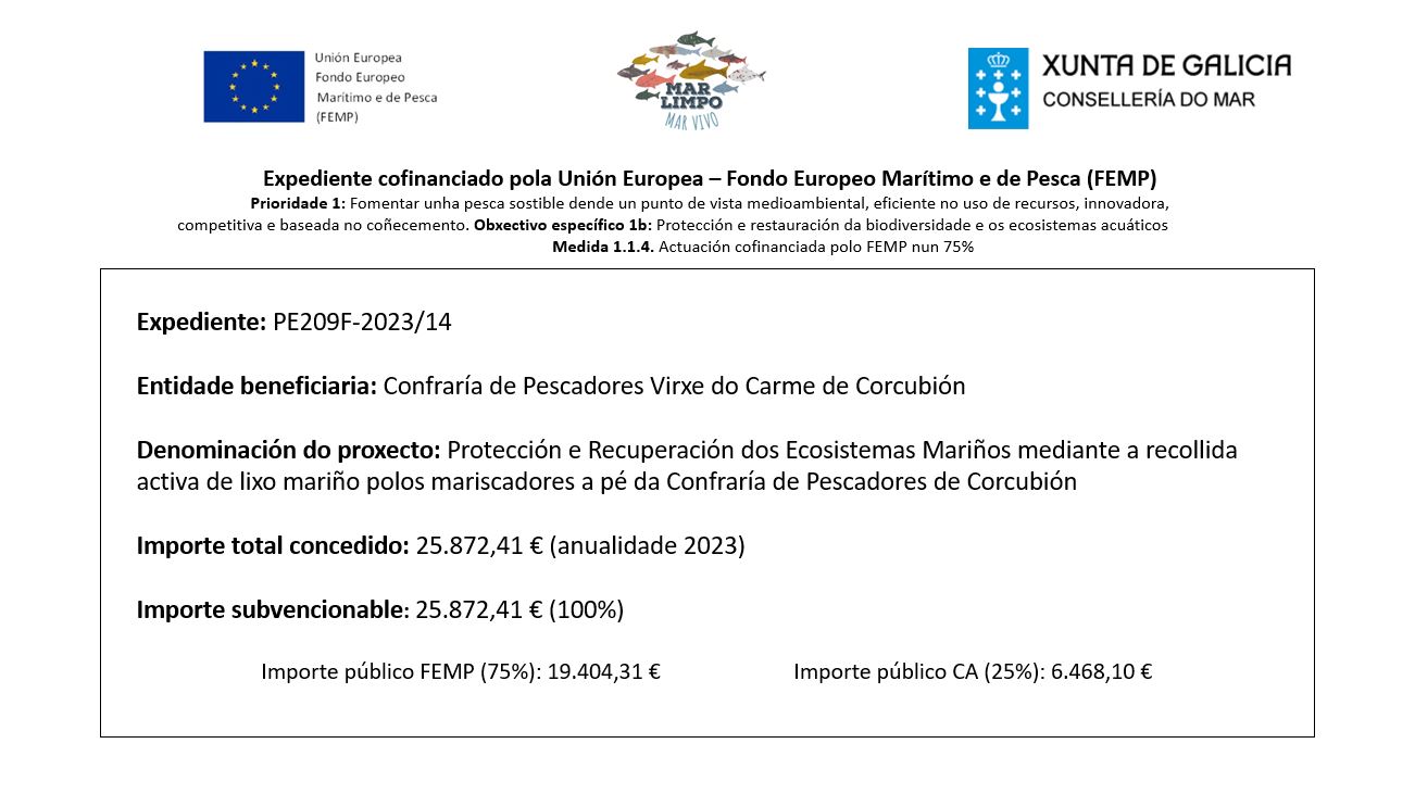 Ao abeiro da Orde do 1 de decembro de 2022 pola que se establecen as bases reguladoras e a convocatoria para o ano 2023 de concesión, en réxime de concorrencia competitiva, de axudas a proxectos colectivos financiados polo Fondo Europeo Marítimo e de Pesca, para a protección e recuperación da biodiversidade e dos ecosistemas mariños no marco de actividades pesqueiras sustentables mediante a recollida de residuos mariños, tramitada como anticipado de gasto, a Confraría de Pescadores de Corcubión presentou o proxecto colectivo "PROTECCIÓN E RECUPERACIÓN DOS ECOSISTEMAS MARIÑOS MEDIANTE A RECOLLIDA ACTIVA DE LIXO MARIÑO POLOS MARISCADORES A PÉ DA CONFRARÍA DE PESCADORES DE CORCUBIÓN".