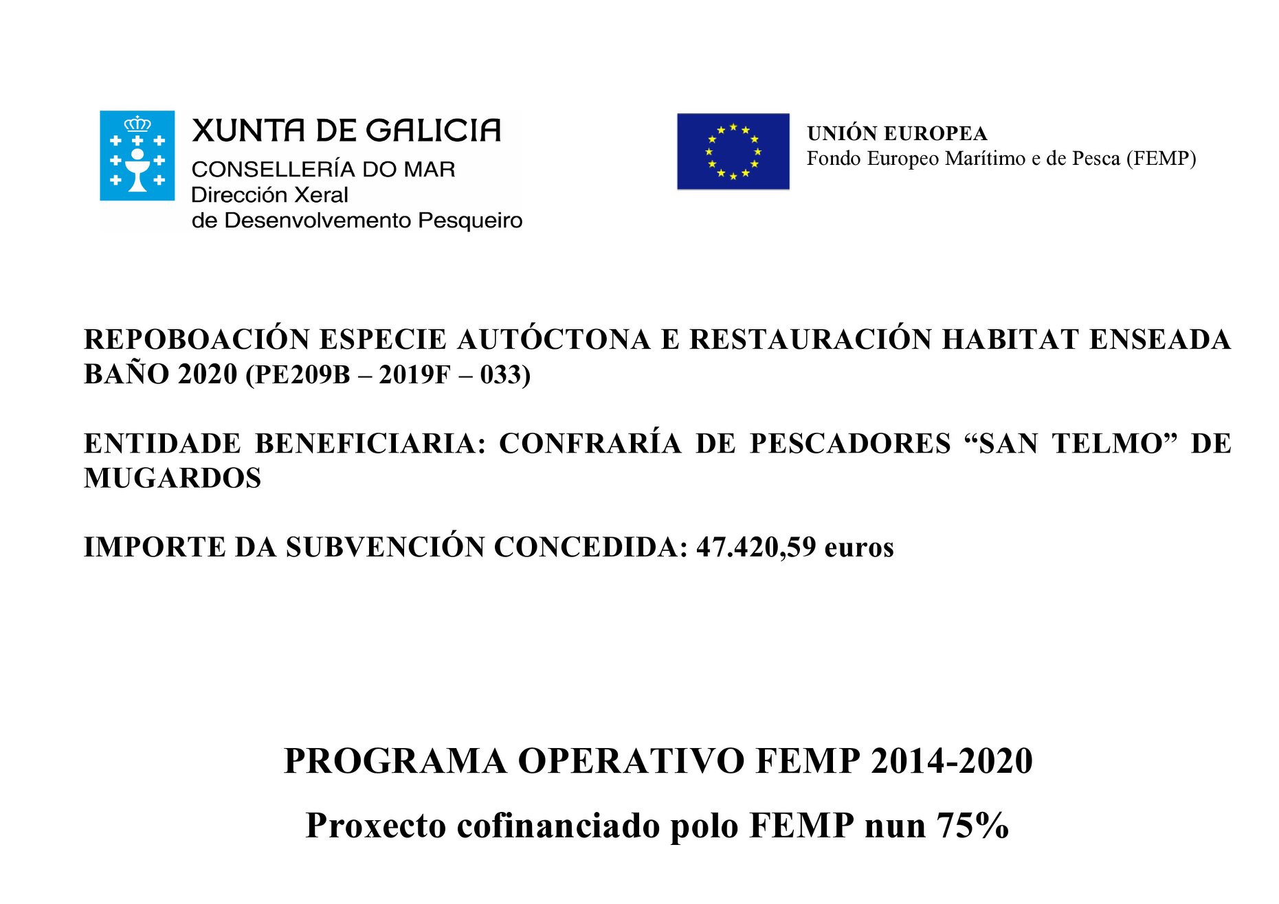 PE209 C-2020 F-052. "Proyecto para la conservación y protección de los recusos marinos vivos y sus ecosistemas de la Cofradía de Mugardos para los años 2020/2021". Importe total concedido: 52.416 € Plazo: Desde lo 1 de julio de 2020 hasta el 30 de junio de 2021 Objeto de la operación: