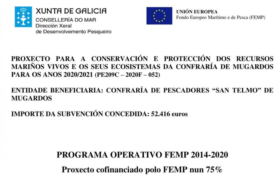 La Consellería del Mar concedió a la Confraria de Mugardos una ayuda, financiada en un 75% por el FEMP, para la realización de proyectos colectivos que contribuan a la protección y recuperación de la biodiversidad marina a través de una mejor gestión y conservación de los recursos marinos y de sus ecosistemas: