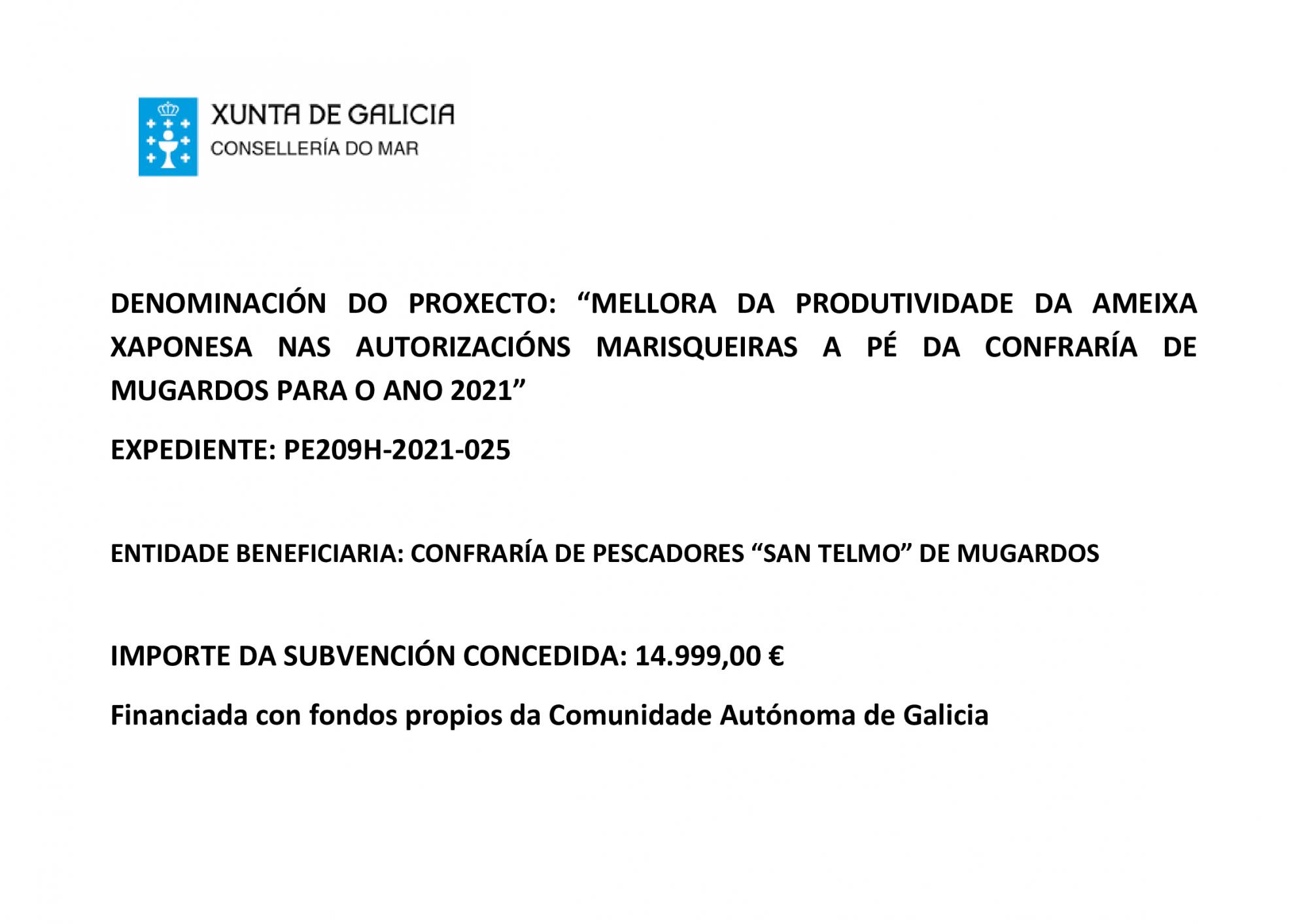 PE209H-2021-025: "Mejora de la productividad de la almeja japonesa en las autorizaciones marisqueras a pie de la Cofradía de Mugardos para el año 2021".
