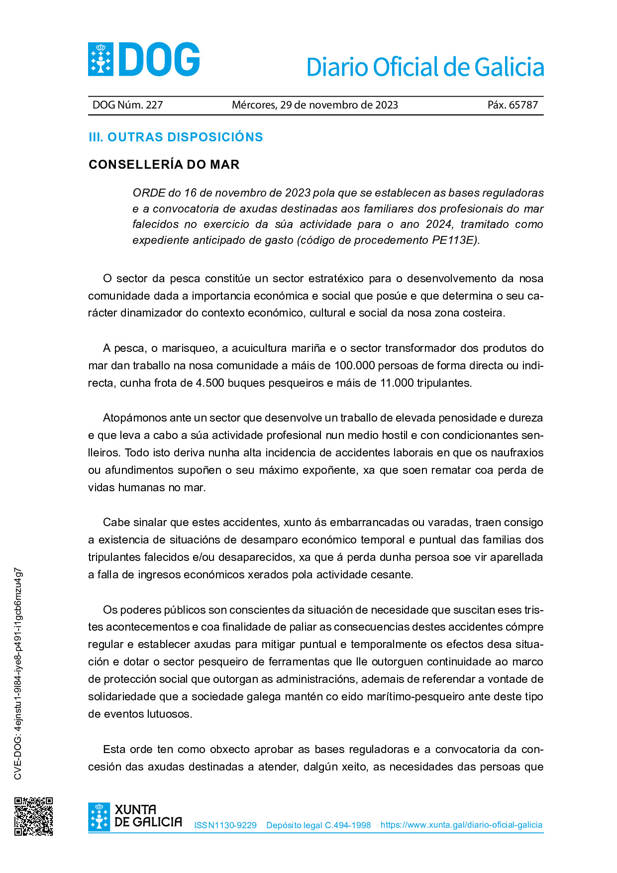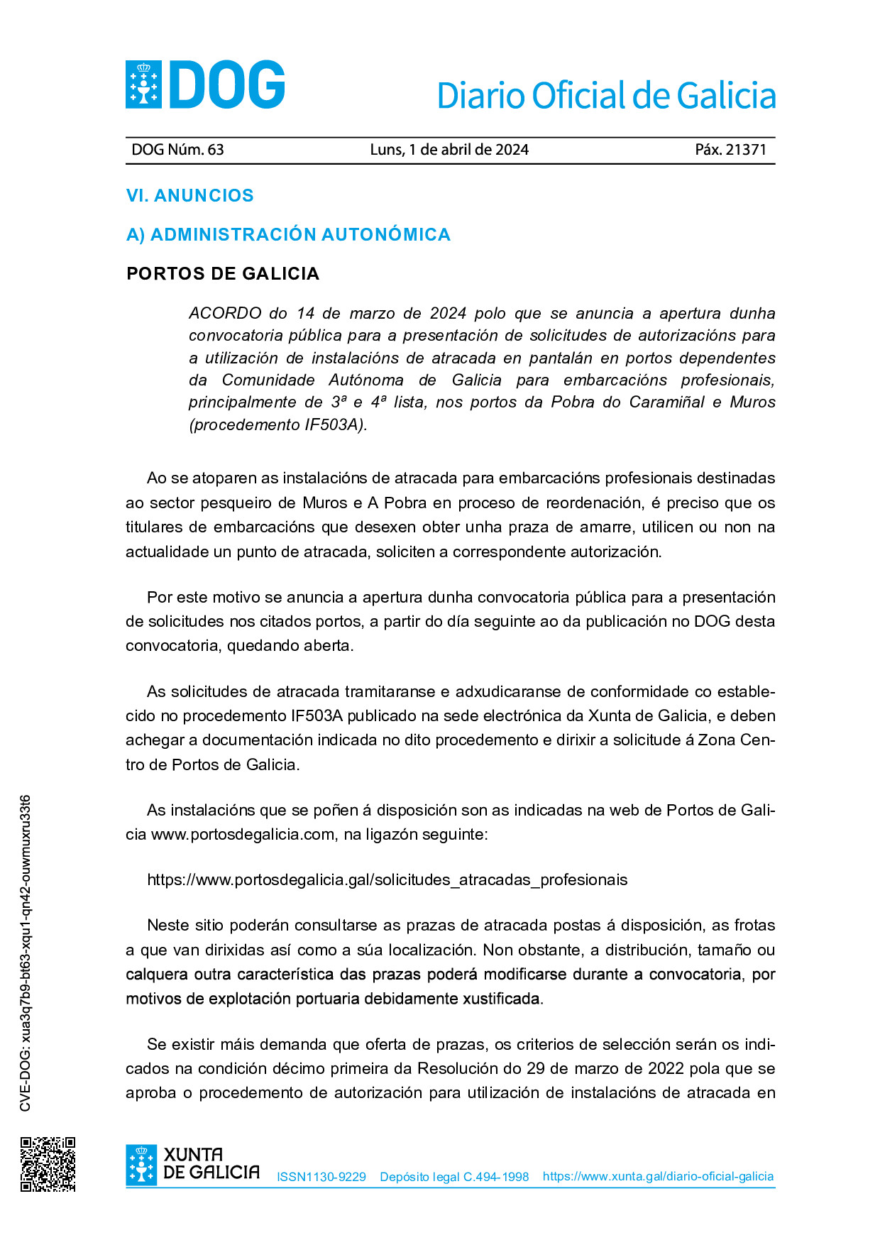 O DOG Núm. 63 de Luns, 1 de abril de 2024 publica o anuncio de PORTOS DE GALICIA do ACORDO do 14 de marzo de 2024 polo que se anuncia a apertura dunha convocatoria pública para