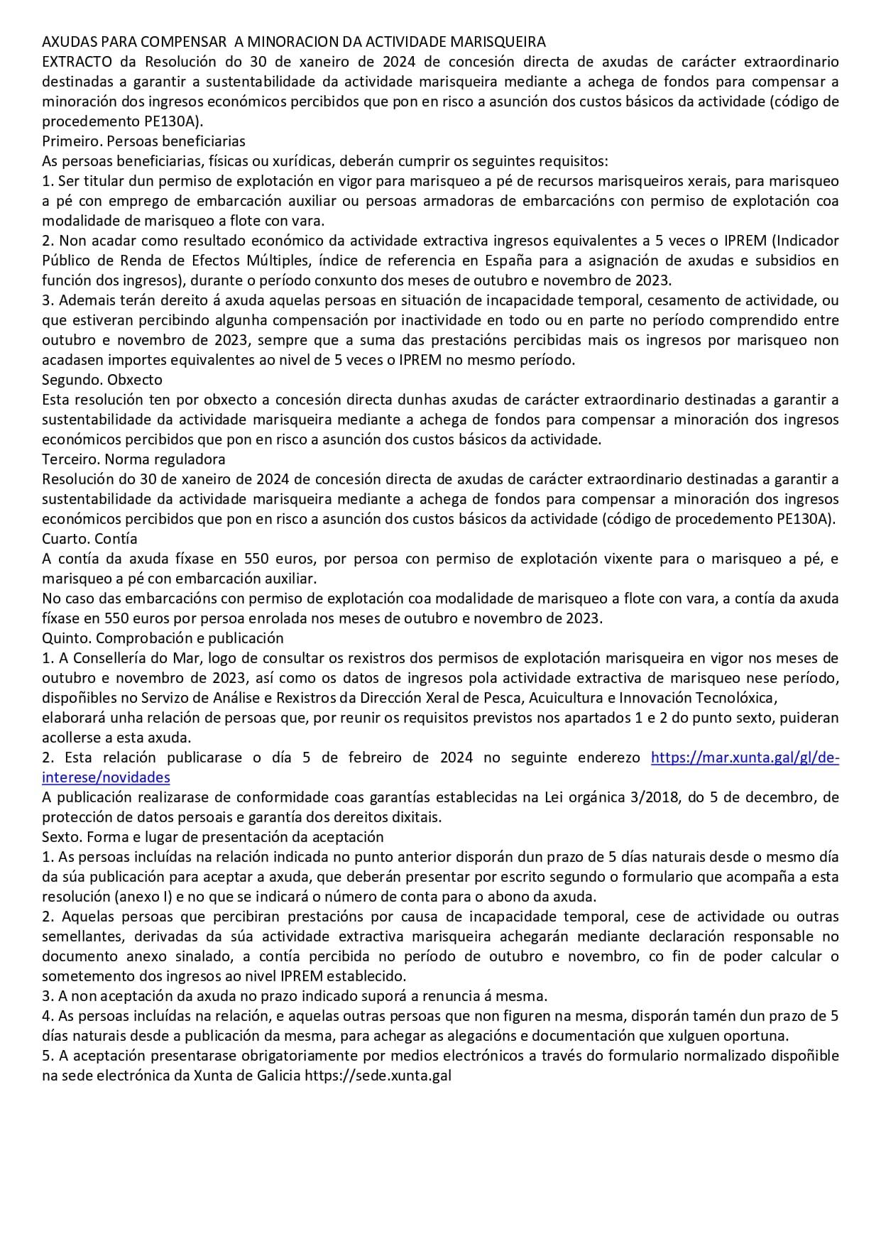 EXTRACTO da Resolución do 30 de xaneiro de 2024 de concesión directa de axudas de carácter extraordinario destinadas a garantir a sustentabilidade da actividade marisqueira mediante a achega de fondos para compensar a minoración dos ingresos económicos percibidos que pon en risco a asunción dos custos básicos da actividade (código de procedemento PE130A).