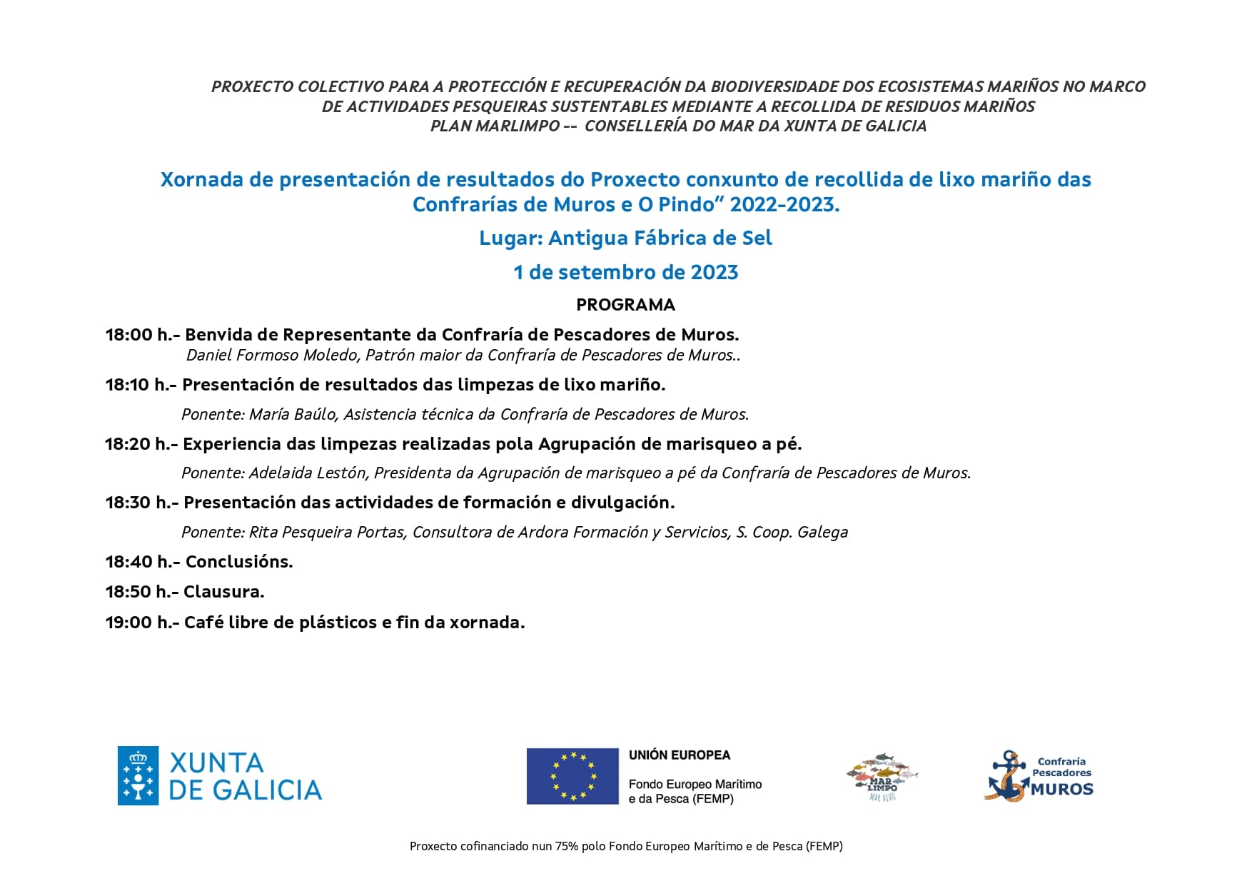 A Confraría de Pescadores de Muros, ten o pracer de convidarvos á Xornada de presentación de resultados do “PROXECTO CONXUNTO DE RECOLLIDA DE LIXO MARIÑO CONFRARÍAS DE MUROS E O PINDO” 2022-2023. Iniciativa enmarcada no Plan MarLimpo- Mar Vivo da Consellería do Mar da Xunta de Galicia para proxectos colectivos para a Protección a Recuperación da Biodiversidade dos Ecosistemas Mariños no Marco de Actividades Pesqueiras Sustentables Mediante a Recollida de Residuos Mariños. A xornada celebrarase o día 1 de setembro de 2023 en horario de 18:00 h a 19:00 h na antiga Fábrica de SelPor temas de aforo é preciso inscribirse enviando un correo a ardora@ardoraformacion.com antes do 29/08/2023