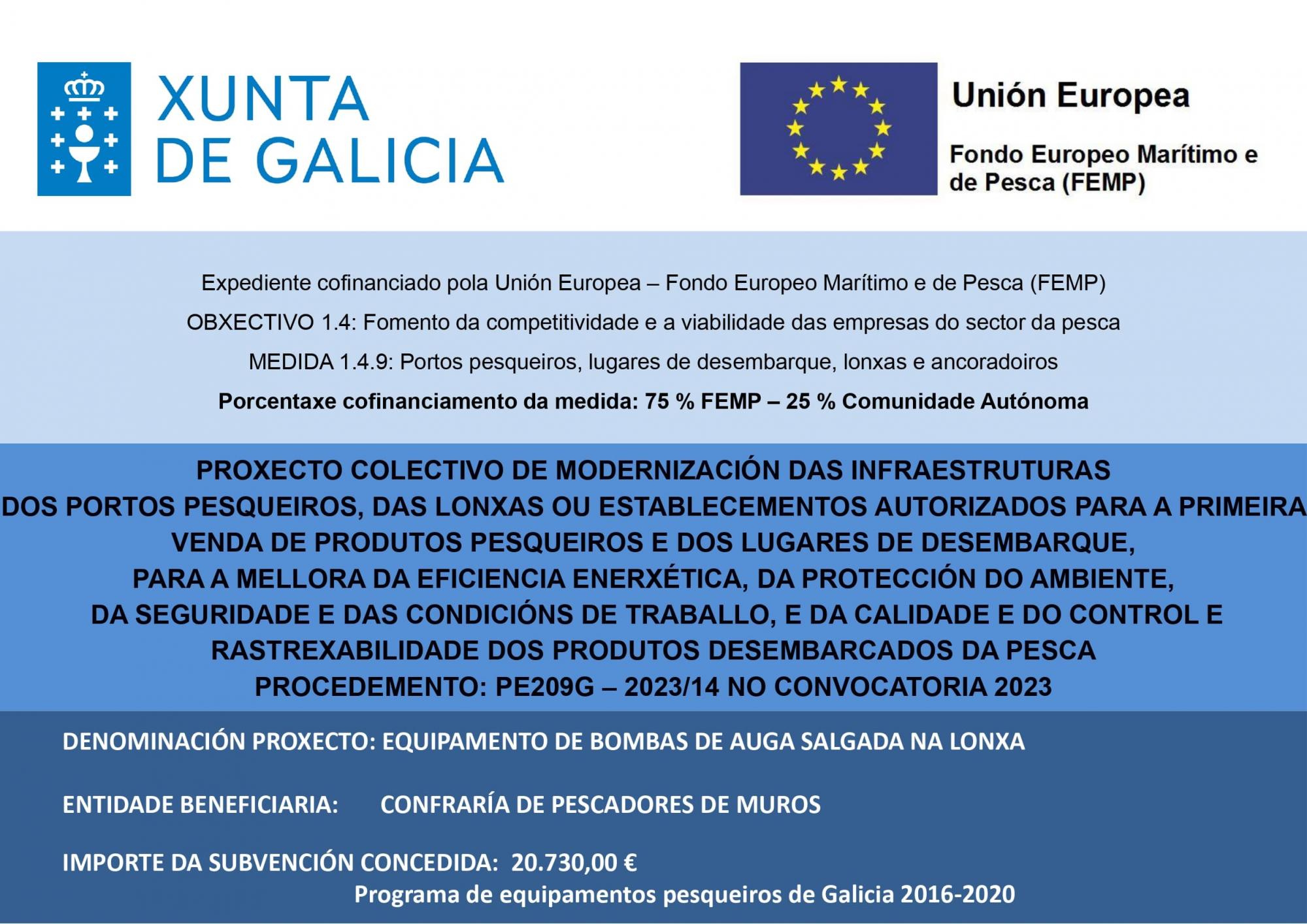 RESOLUCIÓN DA CONSELLERÍA DO MAR POLA QUE SE CONCEDE UNHA AXUDA AO PROXECTO COLECTIVO “EQUIPAMENTO DE BOMBAS DE AUGA SALGADA NA LONXA” PRESENTADO POLA CONFRARÍA DE PESCADORES DE MUROS (NIF G15038508) PARA A MELLORA DA EFICIENCIA ENERXÉTICA, DA PROTECCIÓN DO AMBIENTE, DA SEGURIDADE E DAS CONDICIÓNS DE TRABALLO E DA CALIDADE E DO CONTROL E RASTREXABILIDADE DOS PRODUTOS DESEMBARCADOS DA PESCA, COFINANCIADOS POLO FONDO MARÍTIMO E DE PESCA (FEMP).