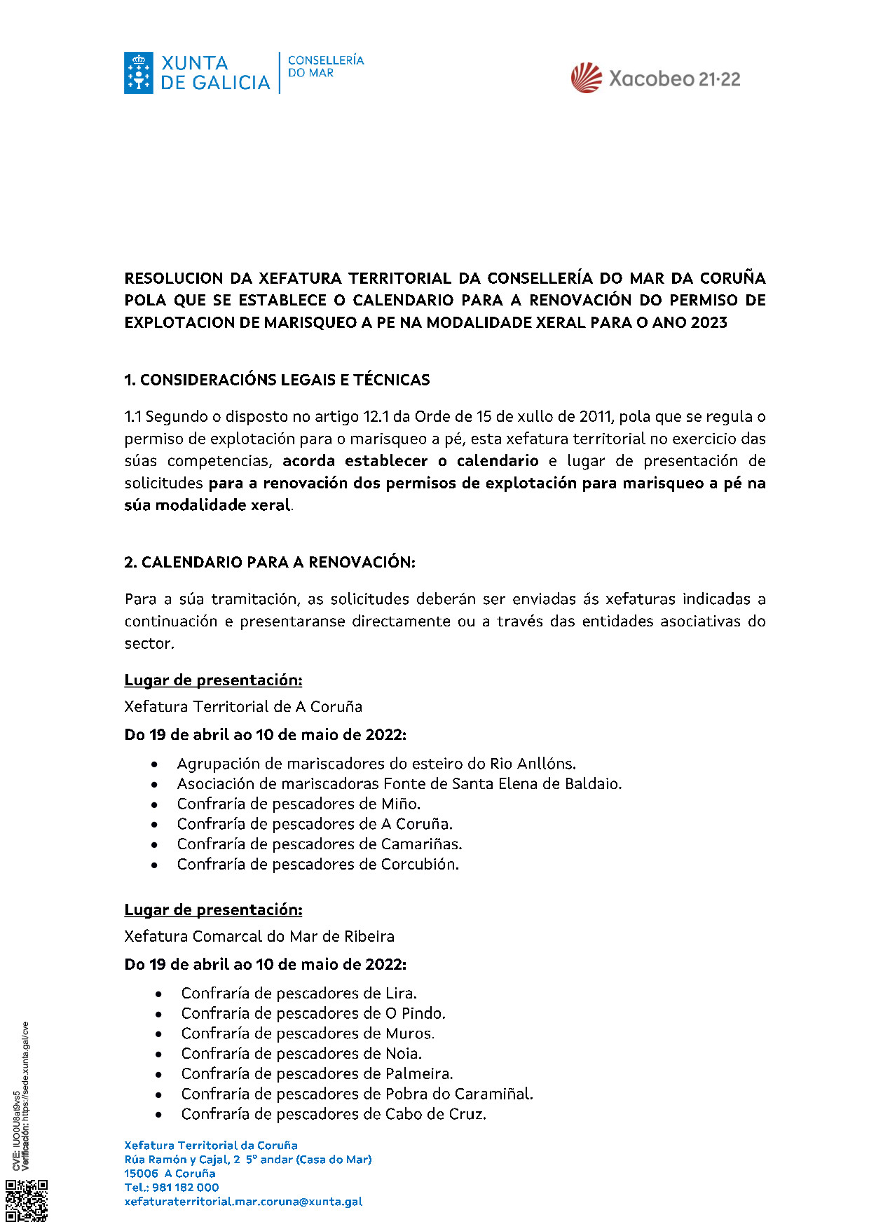 RESOLUCIÓN DA XEFATURA TERRITORIAL DA CONSELLERÍA DO MAR DA CORUÑA POPLA QUE SE ESTABLECE O CALENDARIO PARA A RENOVACIÓN DO PERMISO DE EXPLOTACIÓN DE MARISQUEO A PÉ NA MODALIDADE XERAL PARA O ANO 2023.