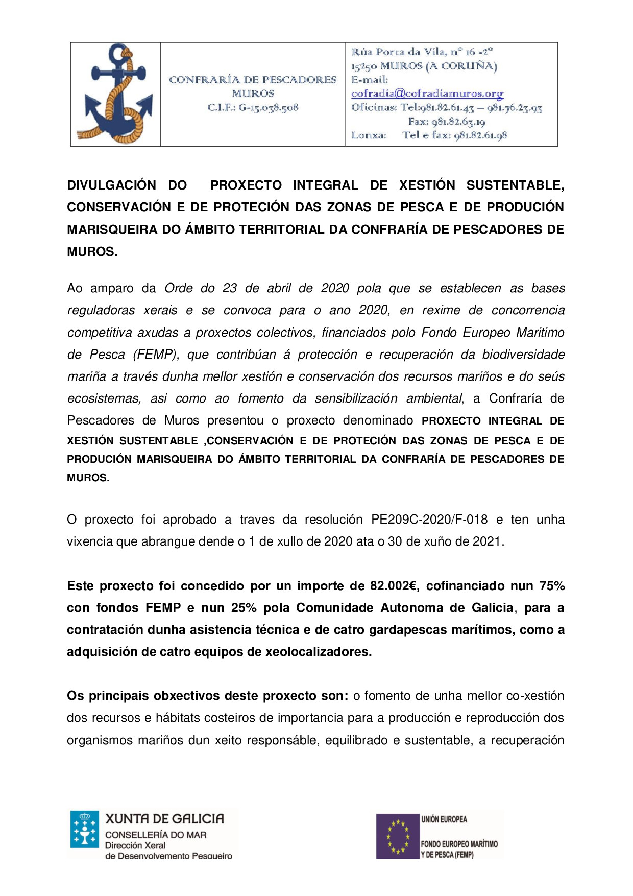 Ao amparo da Orde do 23 de abril de 2020 pola que se establecen as bases reguladoras xerais e se convoca para o ano 2020, en rexime de concorrencia competitiva axudas a proxectos colectivos, financiados polo Fondo Europeo Maritimo de Pesca (FEMP), que contribúan á protección e recuperación da biodiversidade mariña a través dunha mellor xestión e conservación dos recursos mariños e do seús ecosistemas, asi como ao fomento da sensibilización ambiental, a Confraría de Pescadores de Muros presentou o proxecto denominado PROXECTO INTEGRAL DE XESTIÓN SUSTENTABLE ,CONSERVACIÓN E DE PROTECIÓN DAS ZONAS DE PESCA E DE PRODUCIÓN MARISQUEIRA DO ÁMBITO TERRITORIAL DA CONFRARÍA DE PESCADORES DE MUROS.