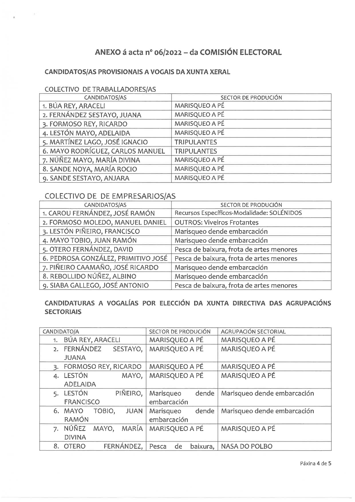 - Proclamación provisional de candidatos/as por colectivo e sectores de produción á Xunta Xeral da confraría e a vogais por elección das directivas das agrupacións sectoriais.