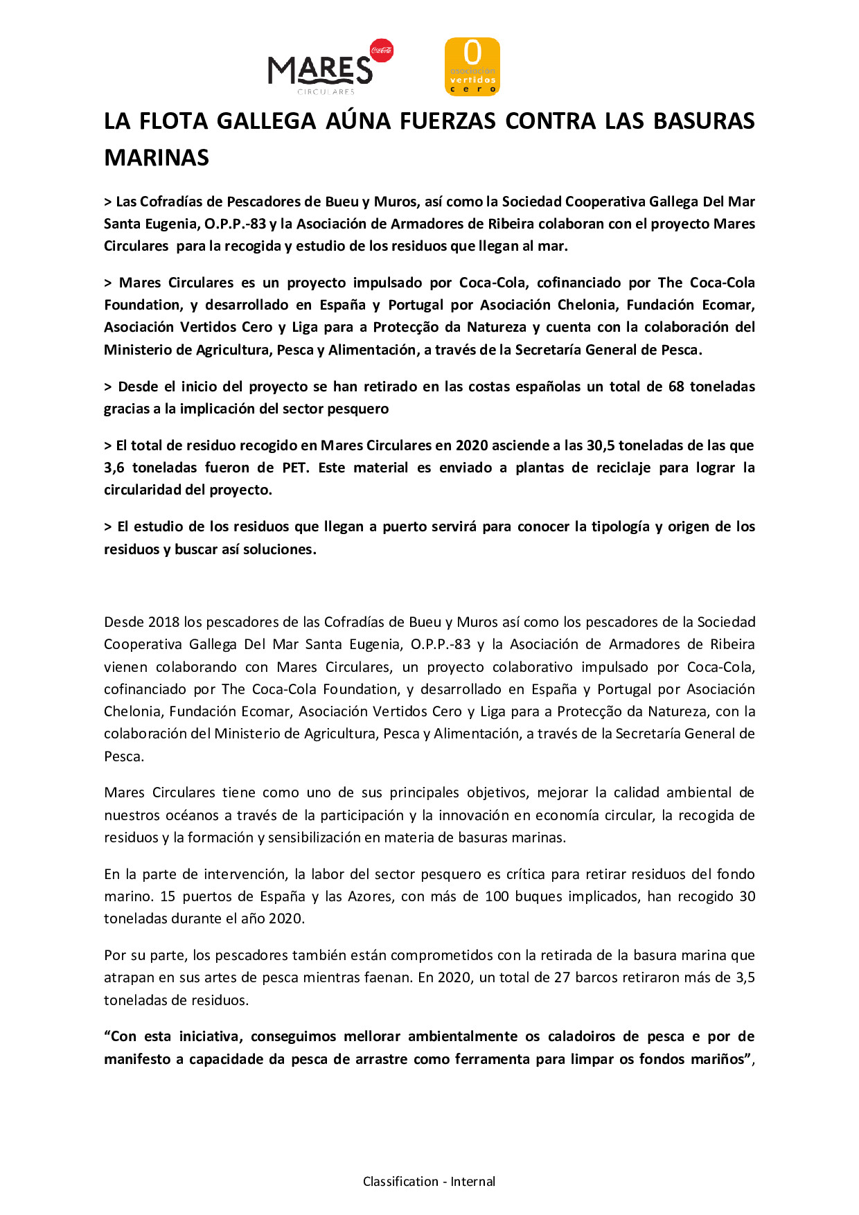 Desde 2018 los pescadores de las Cofradías de Bueu y Muros así como los pescadores de la Sociedad Cooperativa Gallega Del Mar Santa Eugenia, O.P.P.-83 y la Asociación de Armadores de Ribeira vienen colaborando con Mares Circulares, un proyecto colaborativo impulsado por Coca-Cola, cofinanciado por The Coca-Cola Foundation, y desarrollado en España y Portugal por Asociación Chelonia, Fundación Ecomar, Asociación Vertidos Cero y Liga para a Protecção da Natureza, con la colaboración del Ministerio de Agricultura, Pesca y Alimentación, a través de la Secretaría General de Pesca.