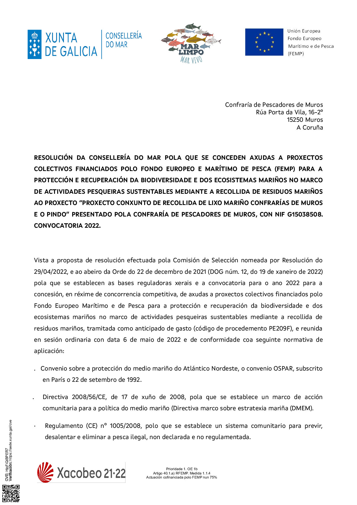 RESOLUCIÓN DA CONSELLERÍA DO MAR POLA QUE SE CONCEDEN AXUDAS A PROXECTOS COLECTIVOS FINANCIADOS POLO FONDO EUROPEO E MARÍTIMO DE PESCA (FEMP) PARA A PROTECCIÓN E RECUPERACIÓN DA BIODIVERSIDADE E DOS ECOSISTEMAS MARIÑOS NO MARCO DE ACTIVIDADES PESQUEIRAS SUSTENTABLES MEDIANTE A RECOLLIDA DE RESIDUOS MARIÑOS AO PROXECTO “PROXECTO CONXUNTO DE RECOLLIDA DE LIXO MARIÑO CONFRARÍAS DE MUROS E O PINDO” PRESENTADO POLA CONFRARÍA DE PESCADORES DE MUROS, CON NIF G15038508. CONVOCATORIA 2022.