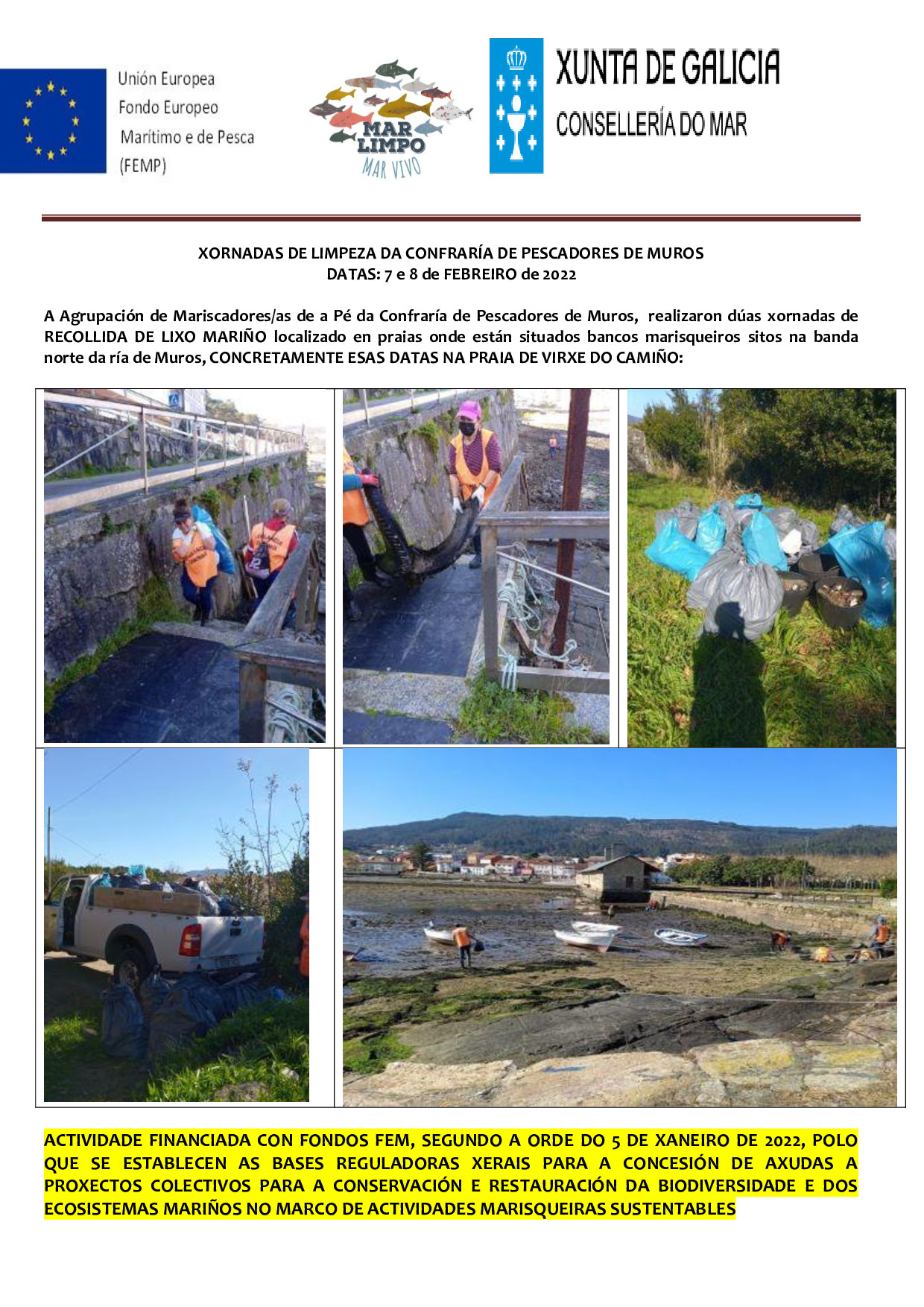 ACTIVIDADE FINANCIADA CON FONDOS FEM, SEGUNDO A ORDE DO 5 DE XANEIRO DE 2022, POLO QUE SE ESTABLECEN AS BASES REGULADORAS XERAIS PARA A CONCESIÓN DE AXUDAS A PROXECTOS COLECTIVOS PARA A CONSERVACIÓN E RESTAURACIÓN DA BIODIVERSIDADE E DOS ECOSISTEMAS MARIÑOS NO MARCO DE ACTIVIDADES MARISQUEIRAS SUSTENTABLES