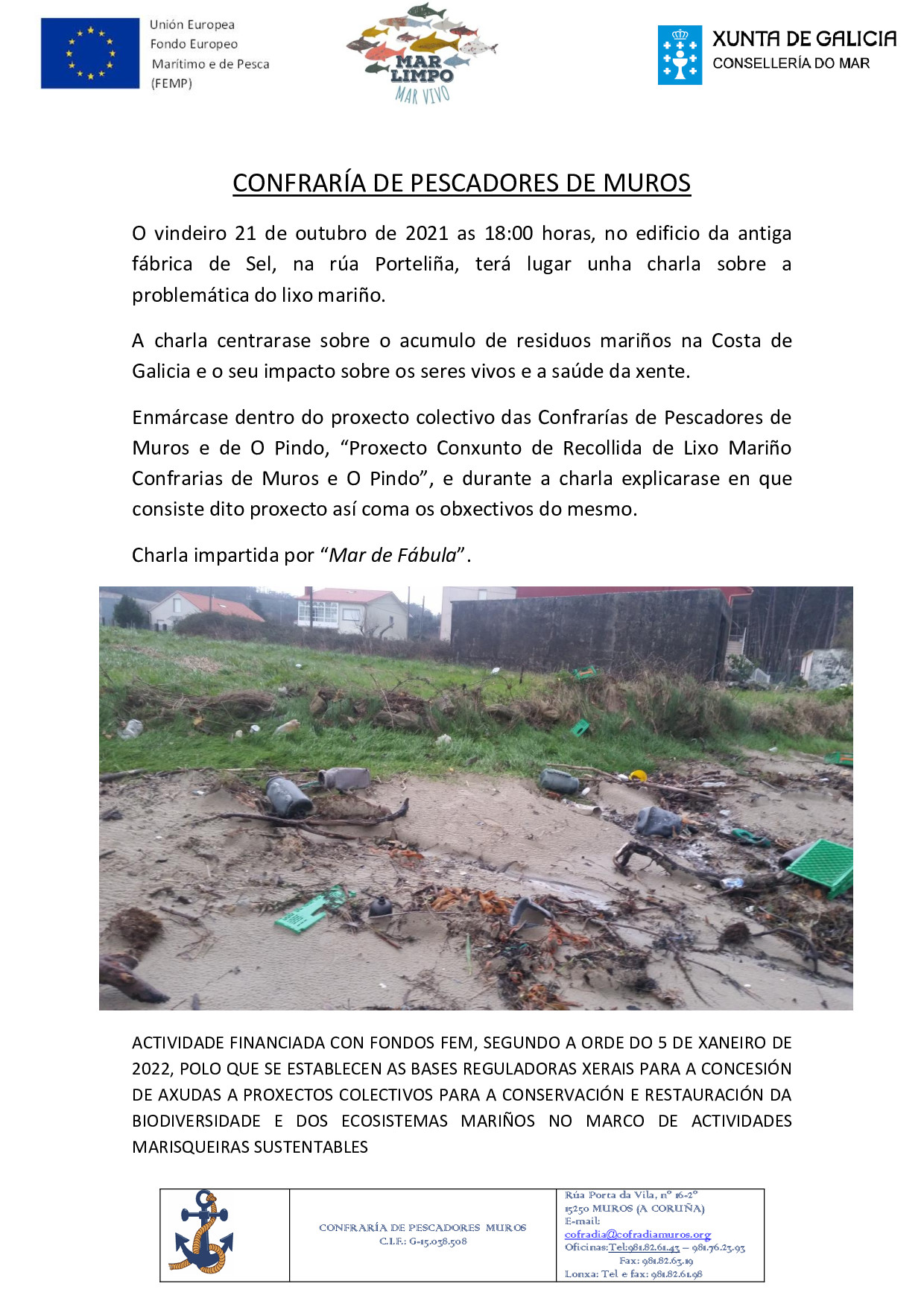 Actividade recollida ao abeiro da ORDE do 11 de xaneiro de 2021 pola que se establecen as bases reguladoras xerais e a convocatoria para o ano 2021 para a concesión, en réxime de concorrencia competitiva, de axudas a proxectos colectivos financiados polo Fondo Europeo Marítimo e de Pesca para a protección e recuperación da biodiversidade e dos ecosistemas mariños no marco de actividades pesqueiras sustentables mediante a recollida de residuos mariños, tramitada como anticipado de gasto (código de procedemento PE209F).