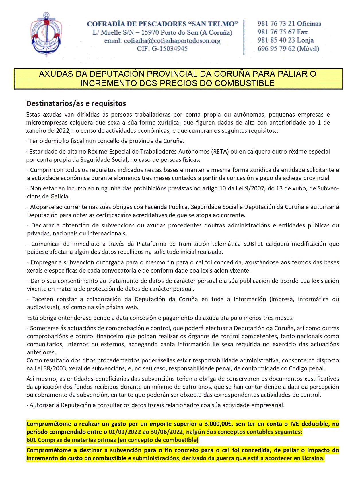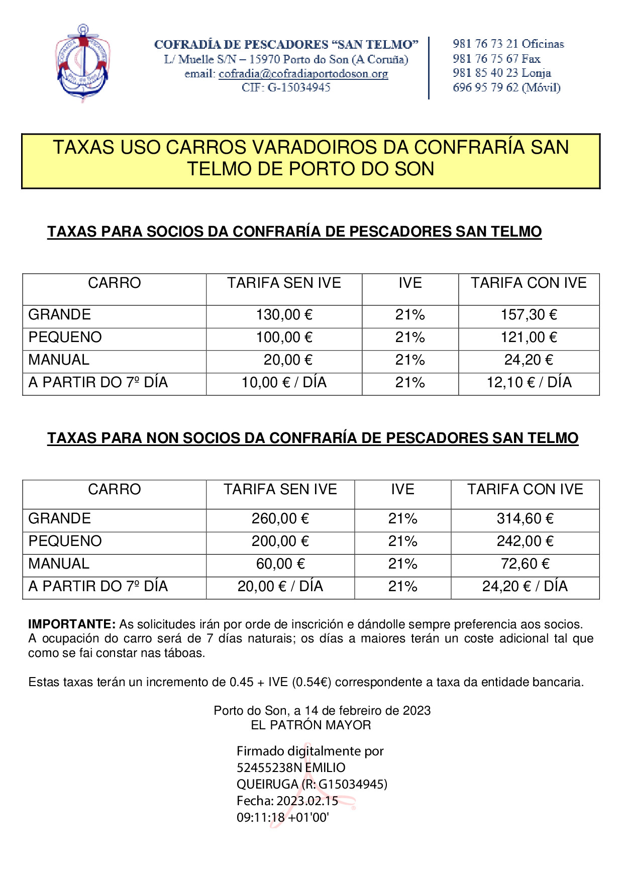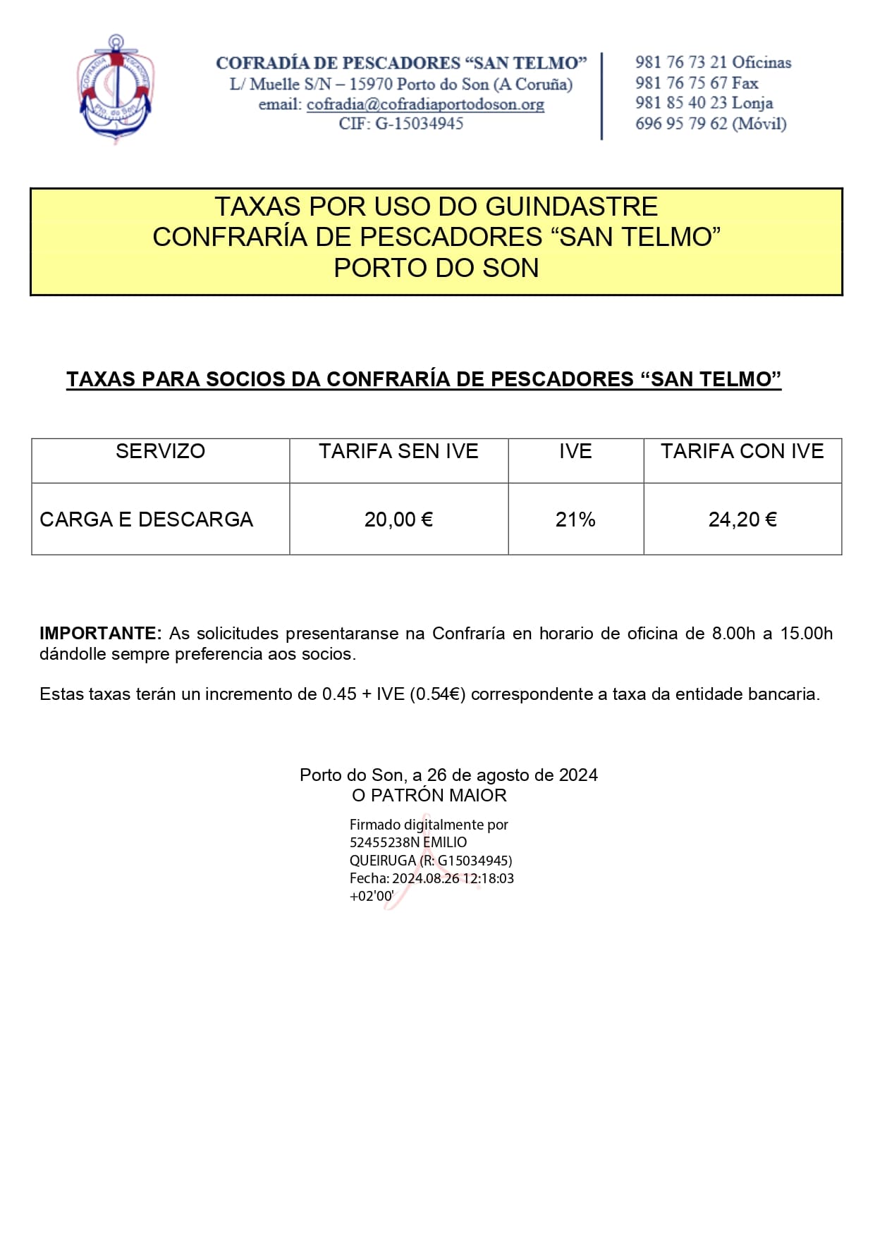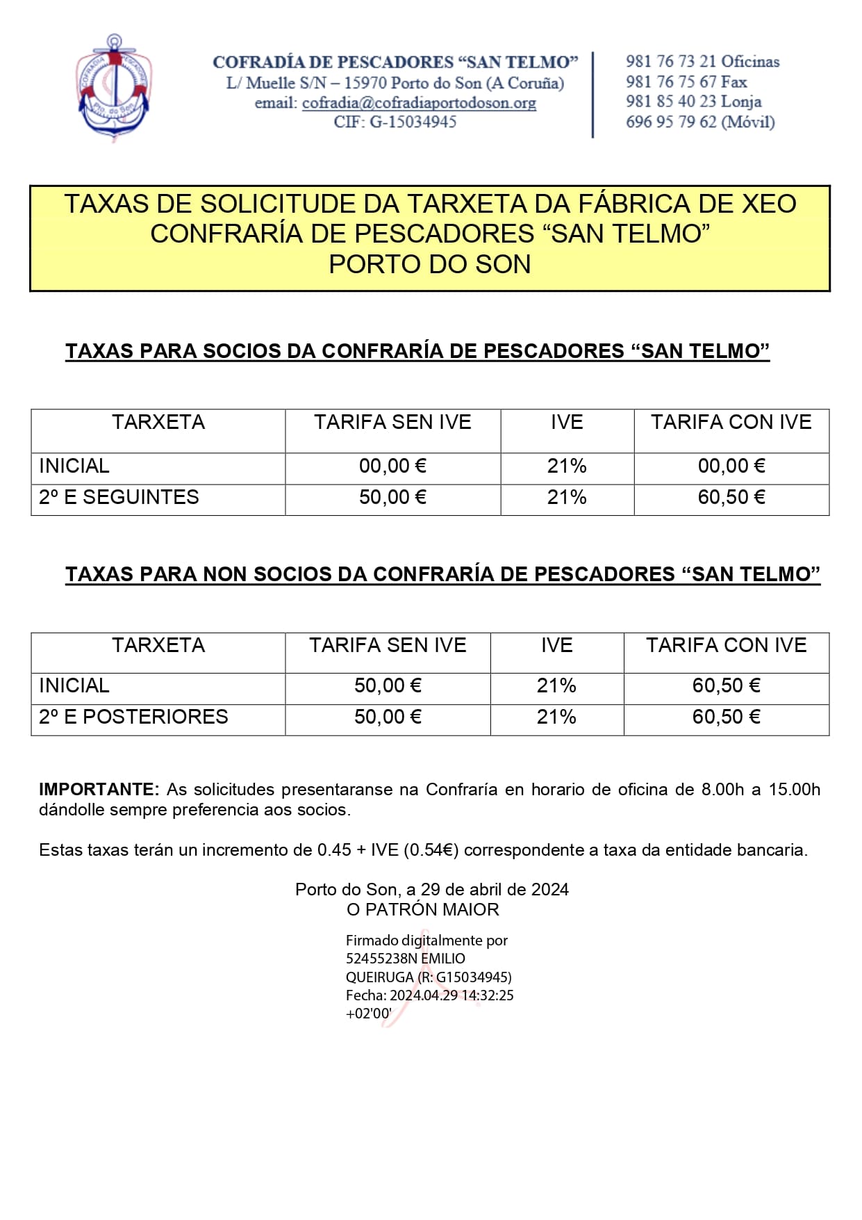 TAXA DE SOLICITUDE DE TARXETAS DA FÁBRICA DE XEO CONFRARÍA DE PESCADORES "SAN TELMO" DE PORTO DO SON