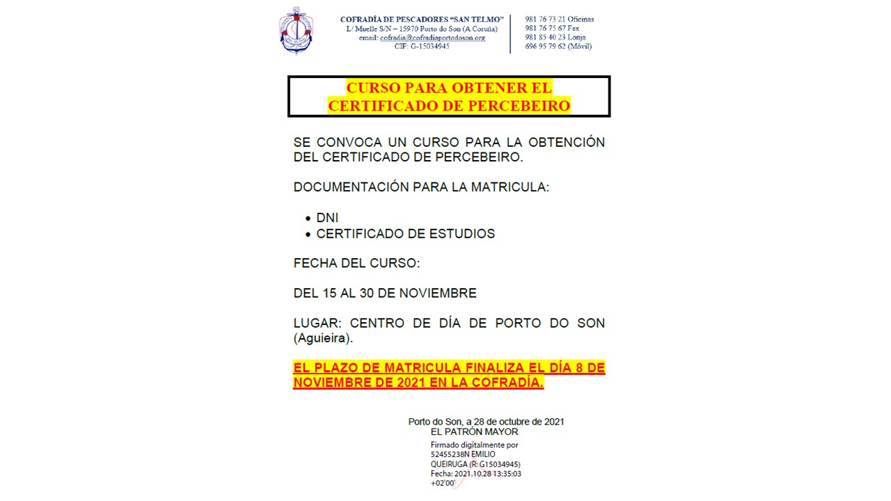 Inscricións abertas ata o 17 de febreiro ás 14:00 h (Confrarías de Porto do Son e Portosín).