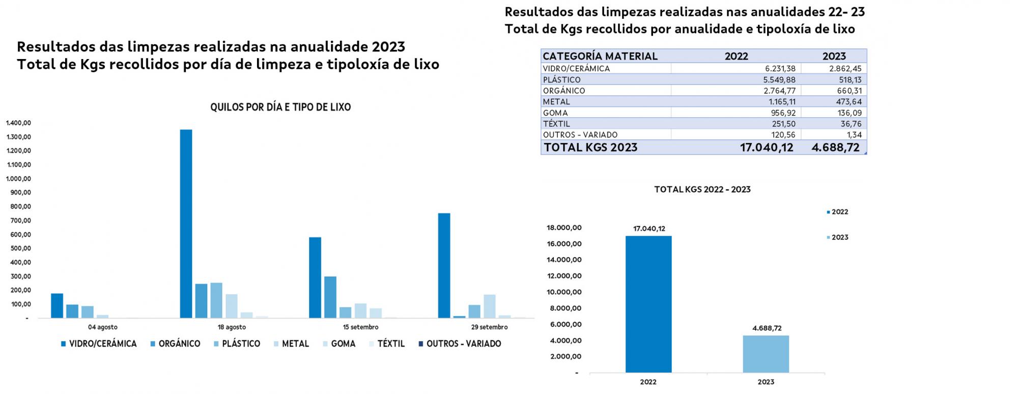 Así mesmo amosamos unha comparativa cos datos recollidos na anualidade 2022 que conformaron un total de 17.040,12 kgs de lixo recollido no que o principal compoñente foi o vidro e a cerámica xunto co plástico que acadan o 70% da totalidade de lixo recollido.
